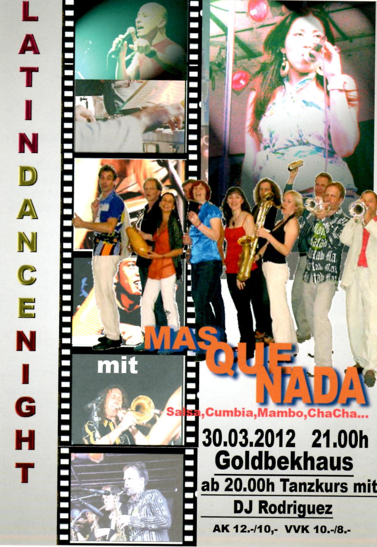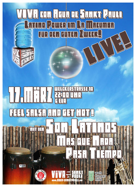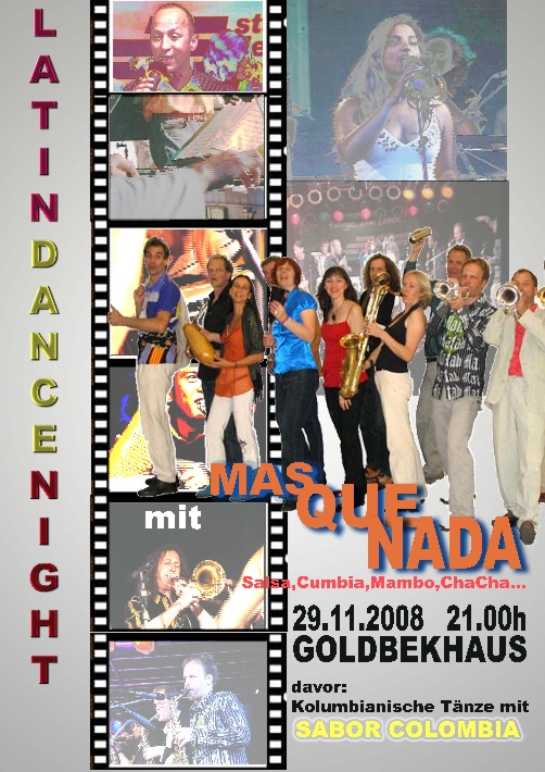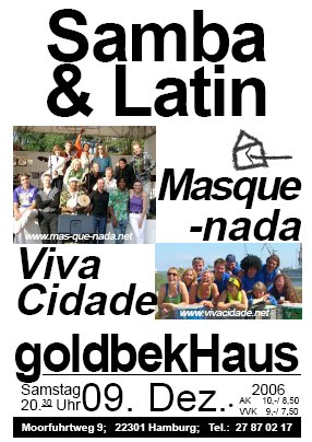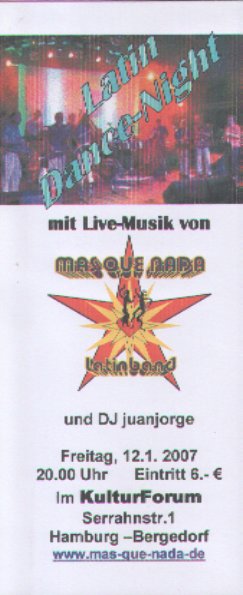 que nada" (Salsa/Caribe-Big Band) juntos con Son Latinos y Pasa Tiempo (Concierto en beneficio de AGUA DE ST. PAULI) en la Latin Dance Academy (Welckerstr. 10, cerca de la Staatsoper Hamburgo) ![]() |
