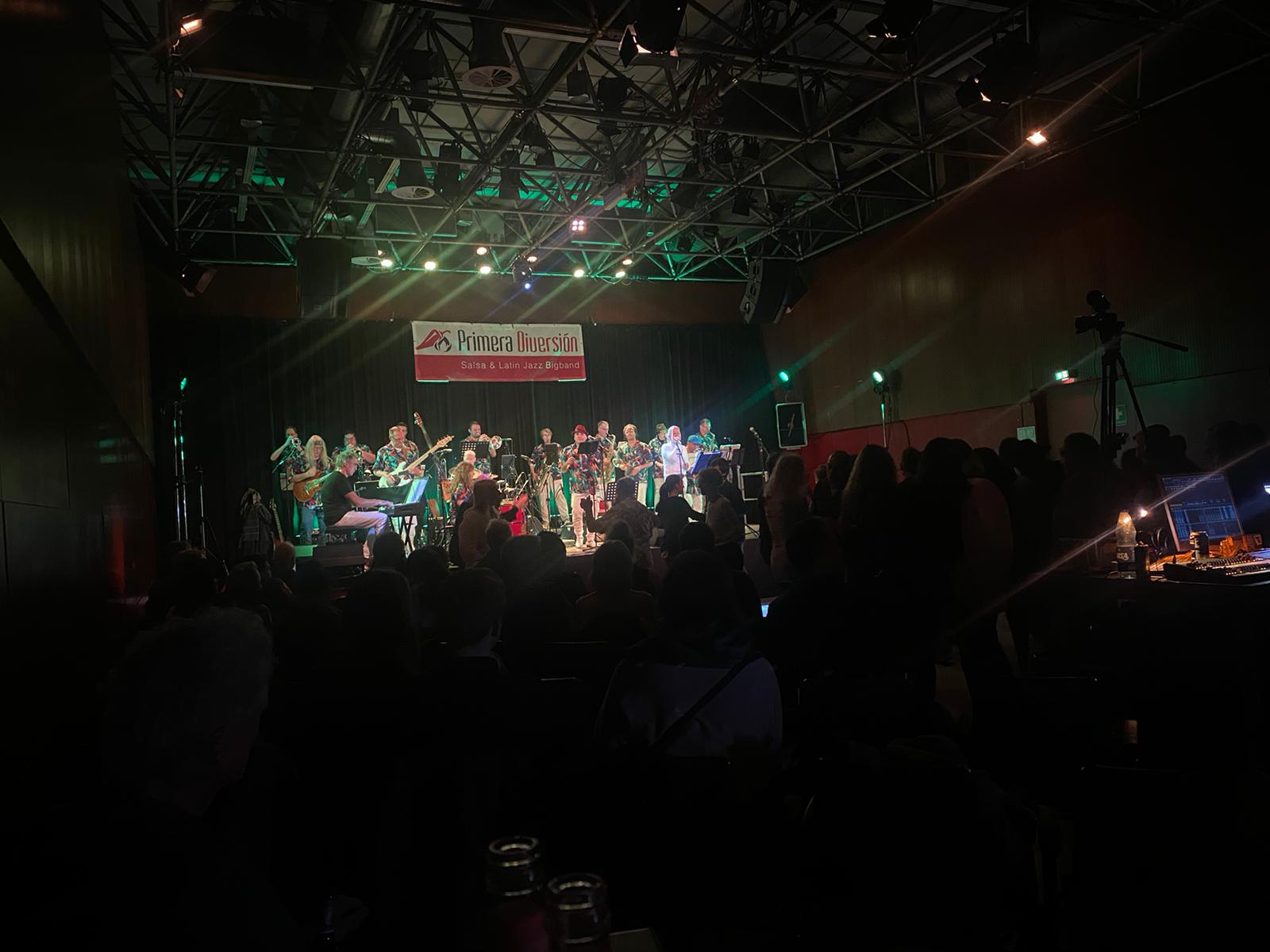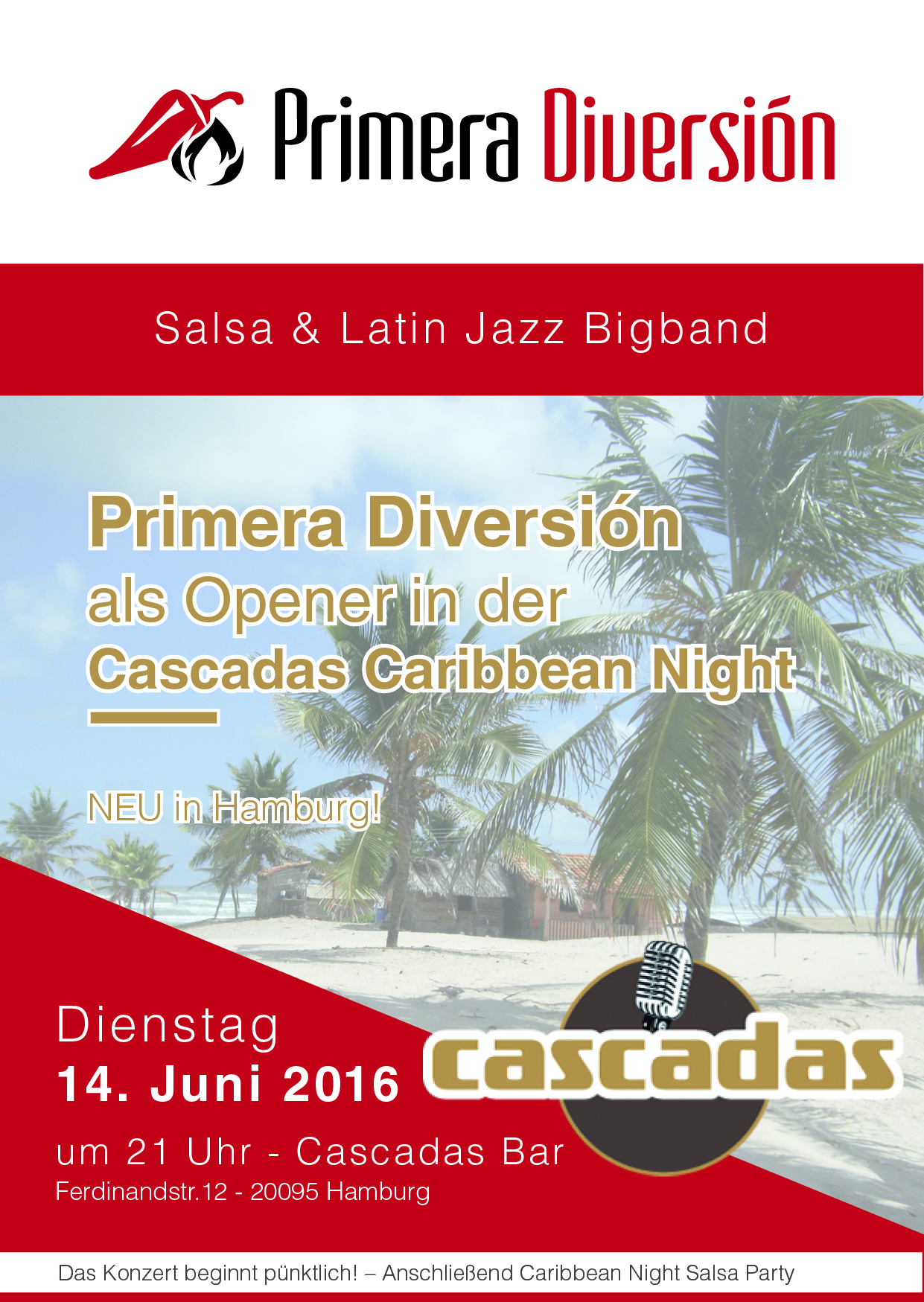 PRIMERA DIVERSIÓN en vivo @ Cotton Club Alter Steinweg 10, 20459 Hamburg Concierto especial de la banda de Salsa y Latin Jazz PRIMERA DIVERSIÓN con 17 músicos en la tarima Músicos: Mayre Ramirez (voz, Cuba), Noydee Fonseca (voz, Cuba) y Giovanni Hernandez (voz, Colombia), trompetas: Hans Knudsen, Leonard Huster and Lorenz Treudler, saxos: Carin Hammerbacher, Ulrike Lindemann, Frank Gertich y Antje Dahmen, además Jean-Philippe Tremblay (Canada) en el trombone. La sección rítmica se formó con Norbert Kujus (g), Oliver Curth (p), Frank Ullrich (b), Jörn Stapelfeldt (dr), Sylvia Franke (congas), Thomas Jegotka (perc) y Maximo Vallejos (perc, Chile). Baile después del Show con DJ Armel hasta medianoche!