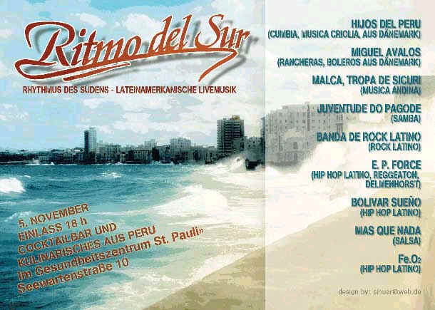 que nada" (Salsa/Caribe-Big Band) „Ritmo del Sur“, Concierto en beneficio del intercambio juvenil Peru - Hamburgo en el Gesundheitszentrum St. Pauli (Seewartenstraße 10, Hamburgo) ![]() |
