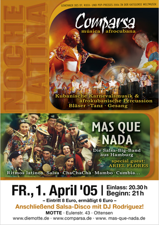 que nada" (Salsa/Caribe-Big Band) juntos con "Comparsa" en "Die Motte" (Eulenstraße 43, 22765 Hamburgo) ![]() |