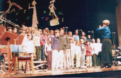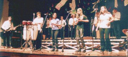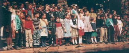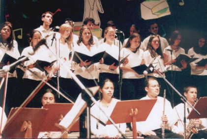 Proyecto de coros con 'Agua Viva' de Mannheim/Alemania En April de 2000 'Agua Viva', bajo la direccion de la Sra. Patricia Rojas-Schubert de Mannheim vino al Colegio Andino para un proyecto de coros. Ellos trabajaron juntos con los coros y con la orquesta del colegio tres dias para realizar un concierto. |