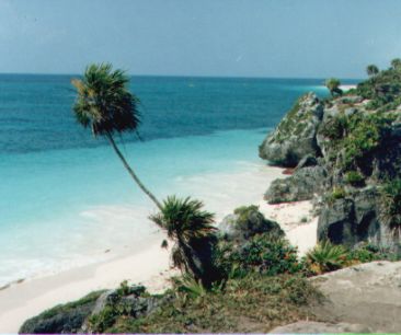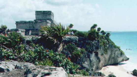 la ruina de Tulum, en estilo tolteco de los mayas, convence por su sitio en una buena zona al frente del mar. |