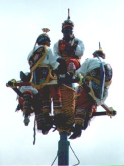 Estos "voladores" se deslizan en cuerdas desde una asta alta. Antes un ritual sagrado, ahora un show para los turistas... |